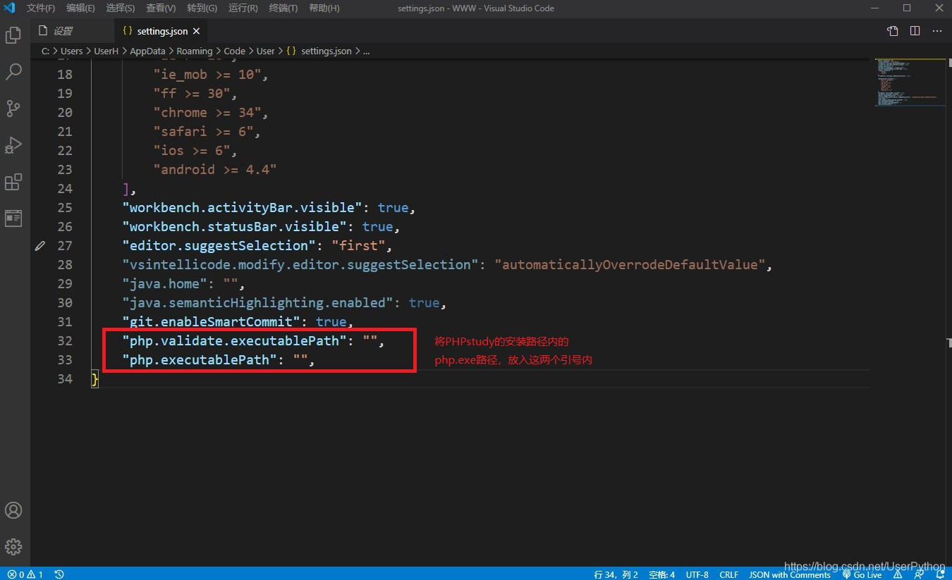 D:/phpstudy_pro/Extensions/php/php7.3.4nts/php.exe;将这个路径复制到上一步找到的json文件中的 php.validate.executablePath 和 php.executablePath 属性值里