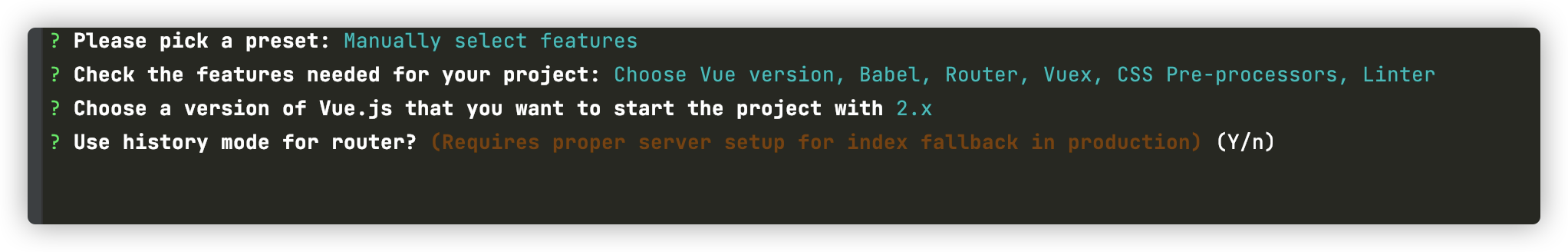 接着会问我们是否使用history router,其实直白来说就是是否路径带 # 号,建议选择 n,否则服务器还要进行配置