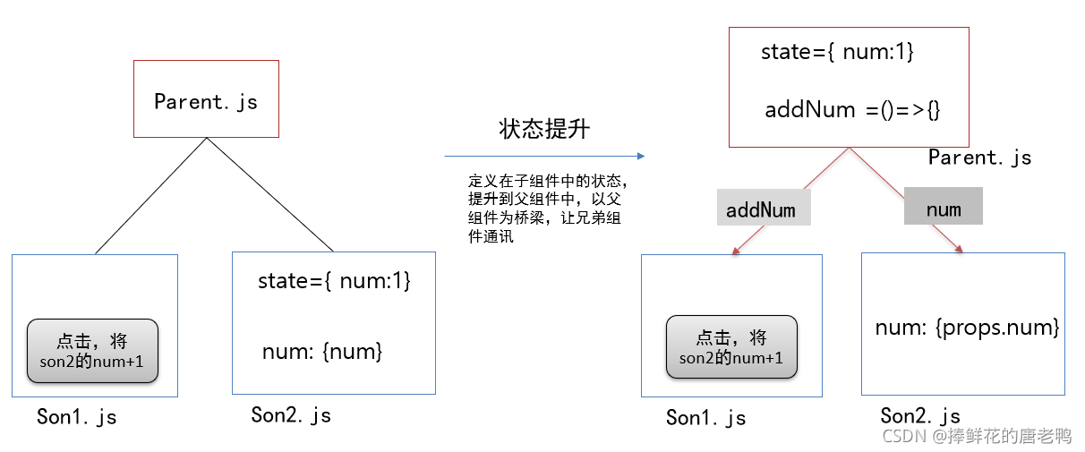 - 将共享状态提升到最近的公共父组件中,由公共父组件管理这个状态