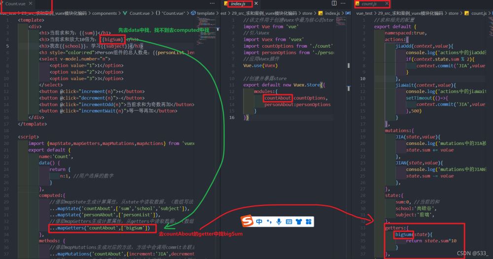 //借助mapGetters生成计算属性,从getters中读取数据。(数组写法)