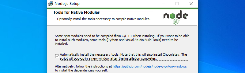 这些工具都可以在用到的时候再安装进行编译,多数时候npm会自动处理这些事情。有的平台也可以在安装Node.js时安装这些工具,比如在windows平台上可以在安装Node.js时勾选安装这些工具:
