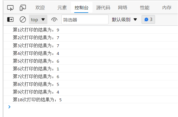 console.log('第'+i+'次打印的结果为:'+random(1,10));