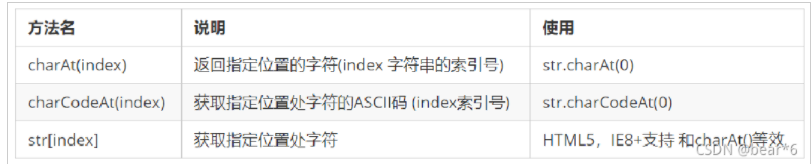 var str = 'Apple'; console.log(str.charAt(3)); // 输出结果:1 console.log(str.charCodeAt(0)); // 输出结果:65(字符A的ASCII码为65) console.log(str[0]); // 输出结果:A