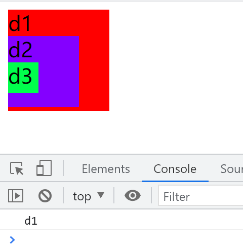 针对上面的例子,如果用冒泡方式,触发顺序应该时:d1——>d2——>d3,那么我们来验证一下: