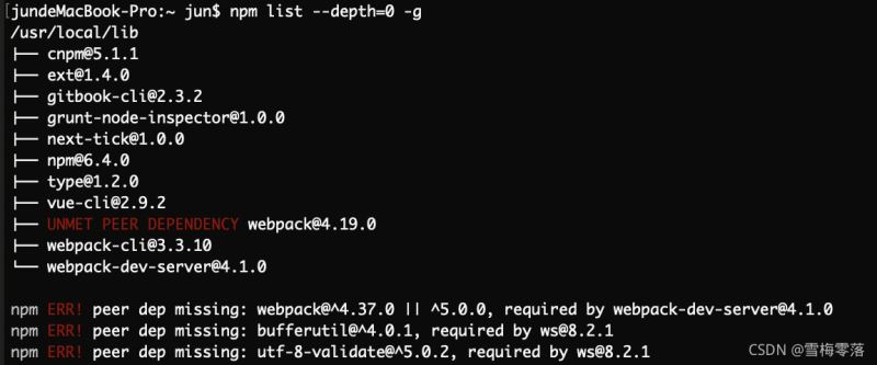 步骤一:运行命令npm list –depth=0 -g 检测下webpack、webpack-cli等版本兼容情况