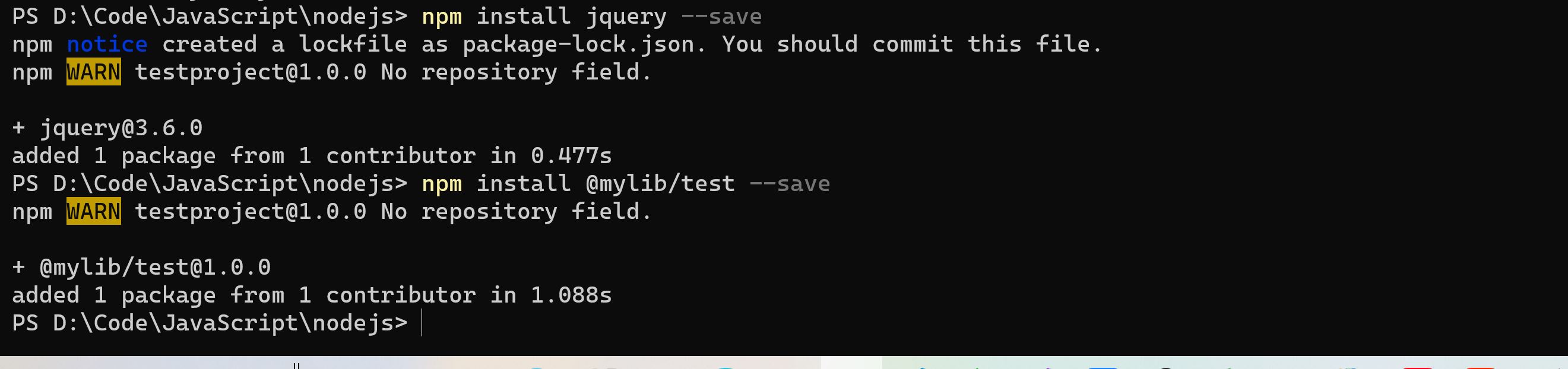 分别输入以下两条命令安装jquery 包 和 @mylib/test 包,其中jquery包时外部仓储源中加载的。