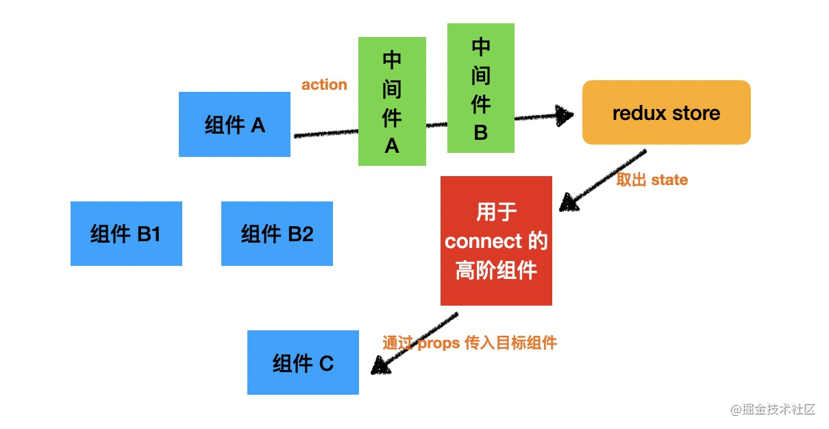 比较流行的中间件有 redux-thunk、redux-saga、redux-obervable,分别支持不同的方式来写组织异步流程,封装和复用异步逻辑。