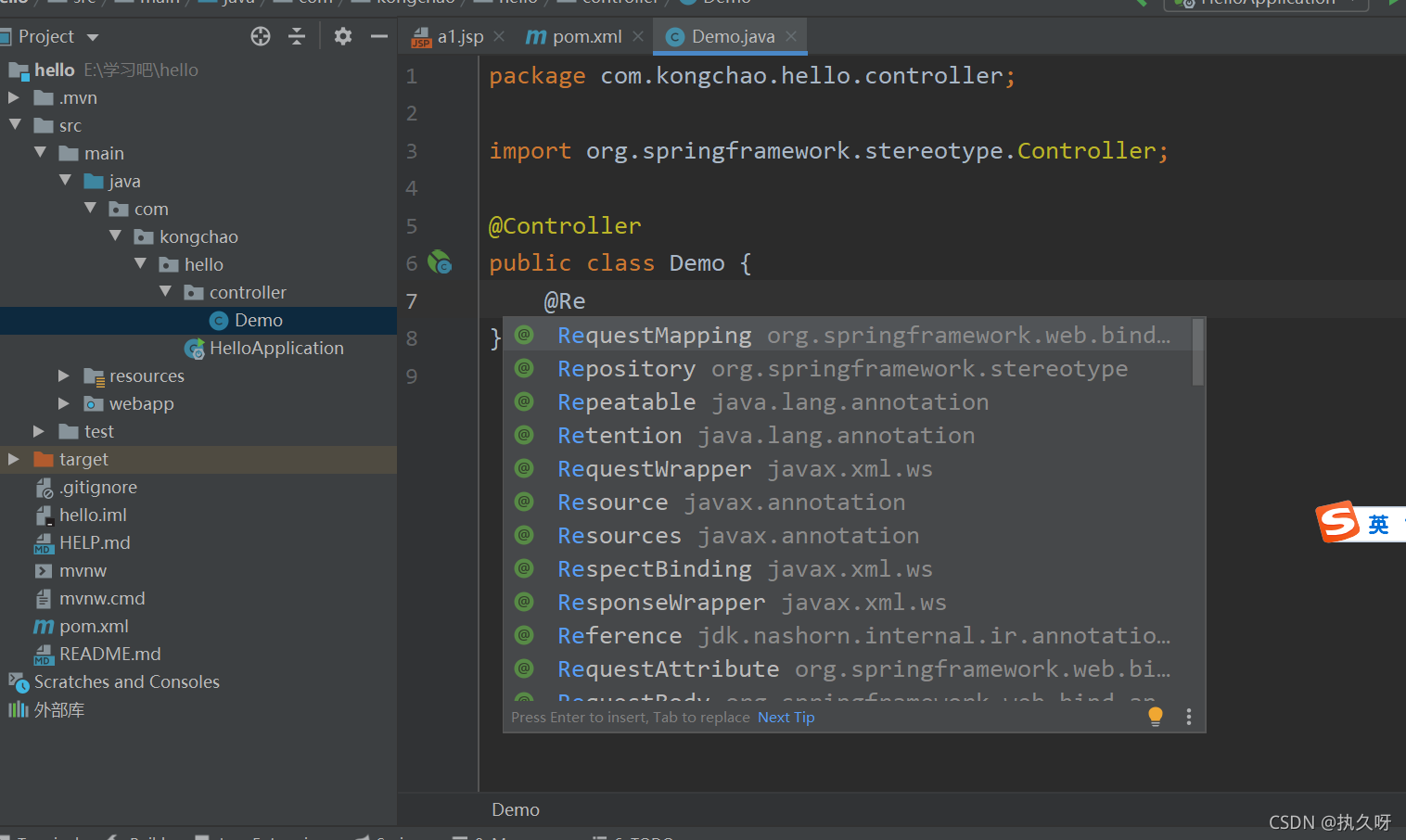第12步:hello前面的都是自己生成的,我们只需要加个controller即可