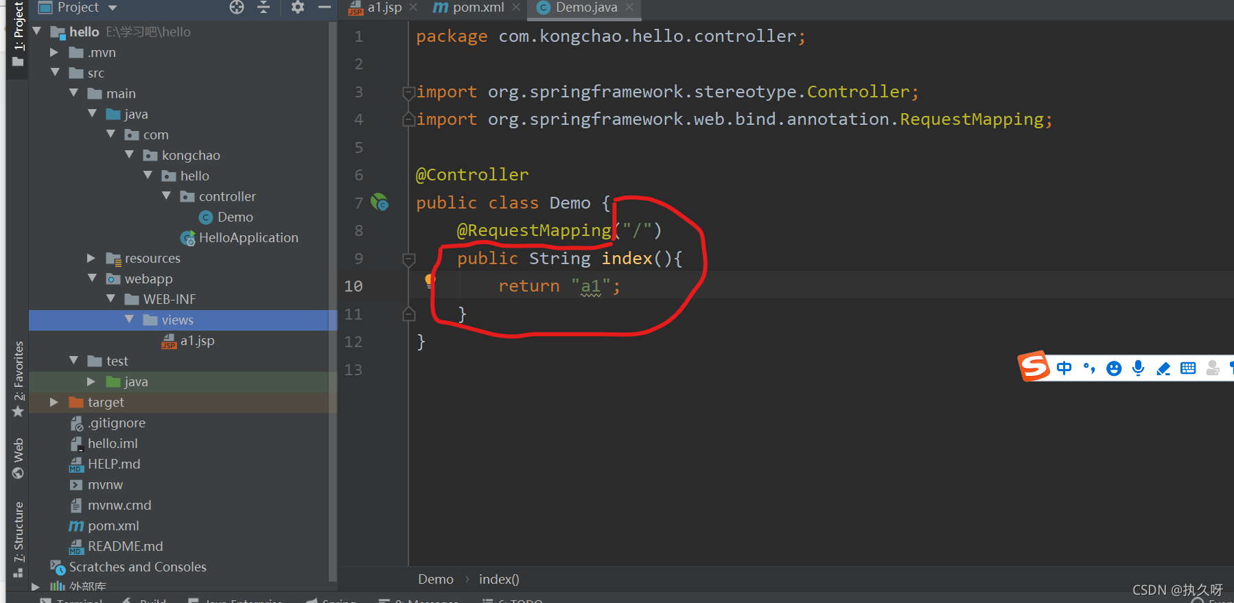 其中@RequestMapping表示从哪里来,而(”/”)表示从当前目录来,return “a1”,这个要和