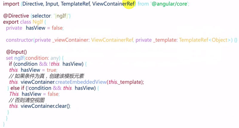 set方法标记为@Input,如果条件为真而且不含view的话,把内部hasView标识位置为true然后通过viewContainer根据template创建一个子view。