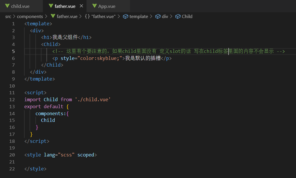 我们知道在Vue中 Child 组件的标签 的中间是不可以包着什么的 。