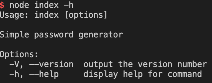 program.version('1.0.0').description('Simple password generator').parse()