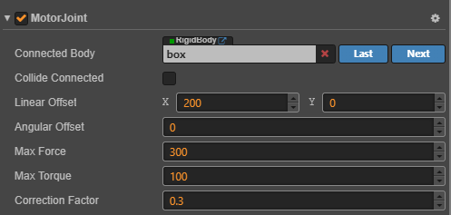 EnableMotor:是否开启马达。开启后刚体会以maxmotorforce的力向指定坐标轴移动,直到速度达到motorspeed。
