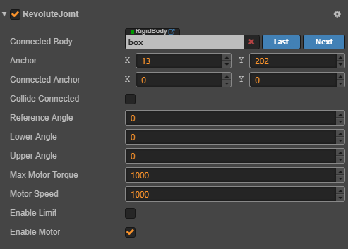 EnableLimit:是否开启关节的距离限制。开启后,关节刚体只能在限制的LowerLimit和UpperLimit范围内移动。这里表示只能在x轴200-400像素之间移动。