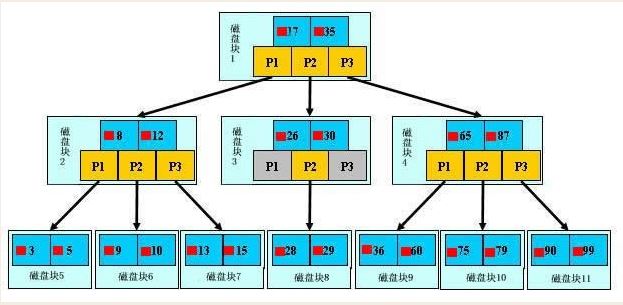 如上图,是一颗b+树,关于b+树的定义可以参见B+树,这里只说一些重点,浅蓝色的块我们称之为一个磁盘块,可以看到每个磁盘块包含几个数据项(深蓝色所示)和指针(黄色所示),如磁盘块1包含数据项17和35,包含指针P1、P2、P3,P1表示小于17的磁盘块,P2表示在17和35之间的磁盘块,P3表示大于35的磁盘块。真实的数据存在于叶子节点即3、5、9、10、13、15、28、29、36、60、75、79、90、99。非叶子节点只不存储真实的数据,只存储指引搜索方向的数据项,如17、35并不真实存在于数据表中。