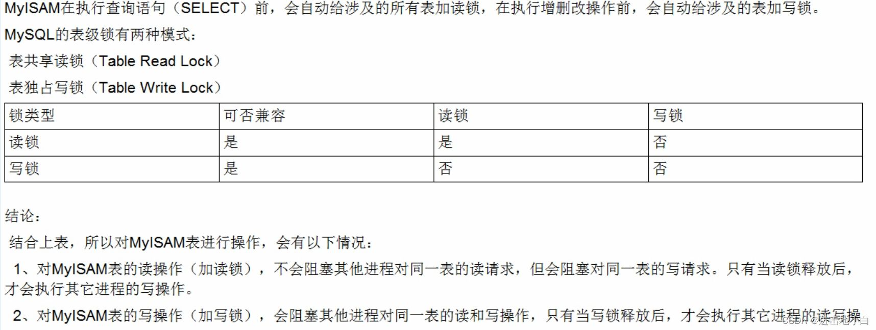 | 行表锁 | 表锁,操作时即使操作一条记录也会锁住一整张表,不适合高并发的操作 | 行锁,操作时只锁住某一行,不会影响到其他行,适合高并发 |