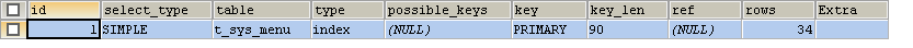 在要执行的sql前加上explain 例如:EXPLAIN SELECT menu_name FROM t_sys_menu ORDER BY menu_id DESC;