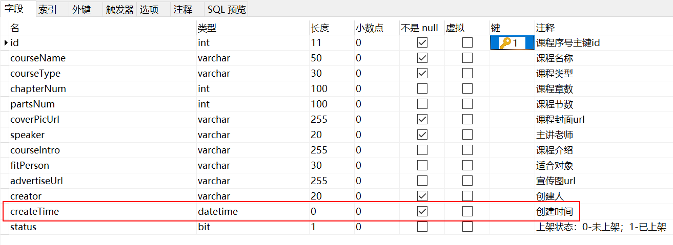 这里用到一张talk_course表作为查询sql语句的执行表单,表的字段如下: