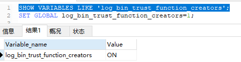 SHOW VARIABLES LIKE ‘log_bin_trust_function_creators’;