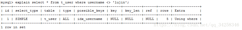 4、mysql使用不等于(!= 或者<>)的时候,无法使用索引,会导致索引失效