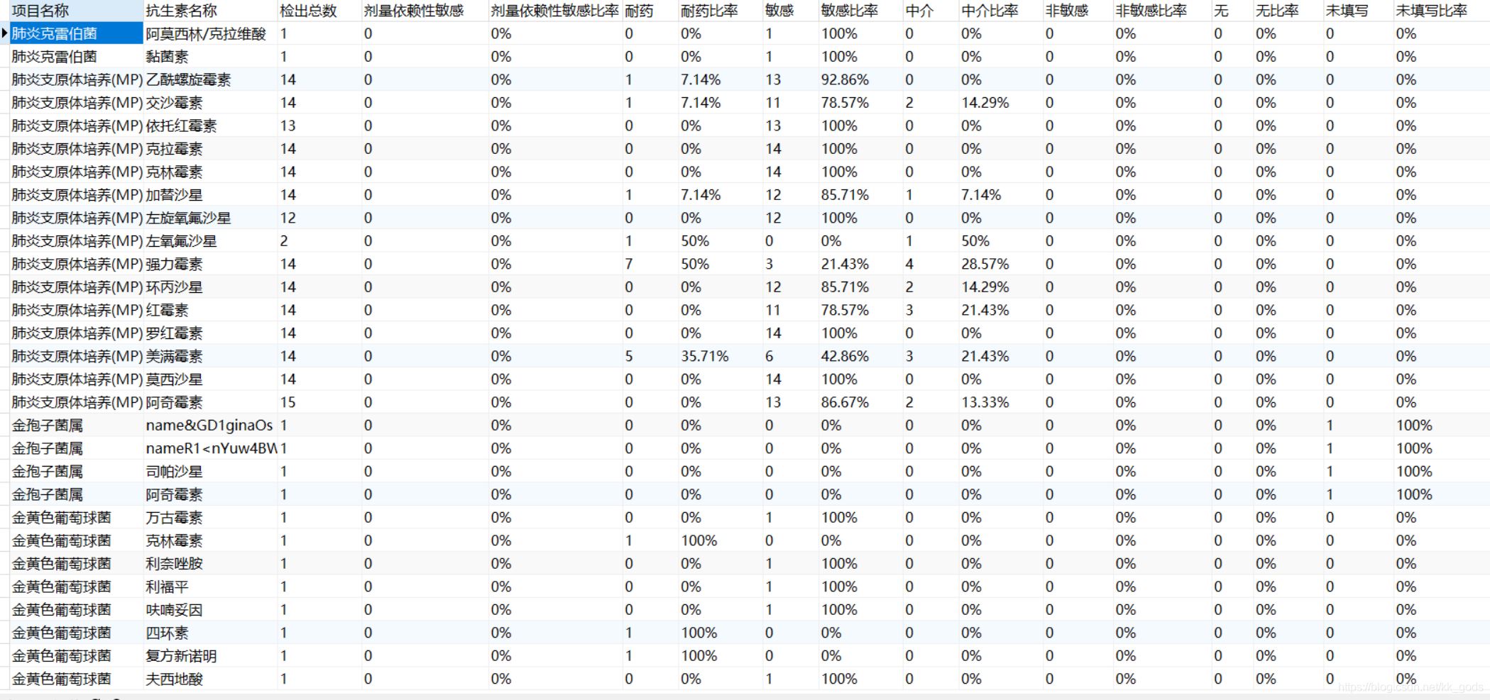 我们有三张表,我们需要分类统计一段时间内抗生素的不同药敏结果,即 report_item_drugs 表的 drugs_result, 在不同项目project_name 和不同抗生素 antibiotic_dict_name 下的占比,并将药敏结果显示在行上,效果如下: