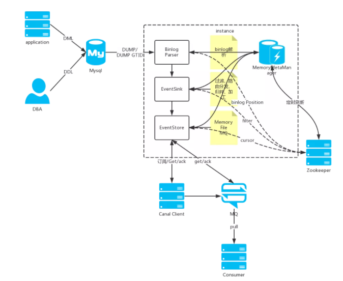 - canal模拟mysql slave的交互协议,伪装自己为mysql slave,向mysql master发送dump协议