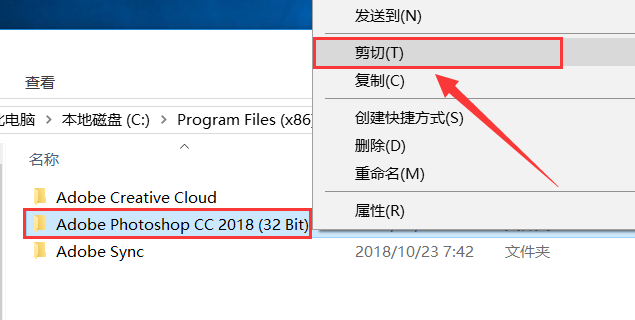 10.鼠标右击【Adobe Photoshop CC 2018 (32 Bit)】文件夹后选择【剪切】。