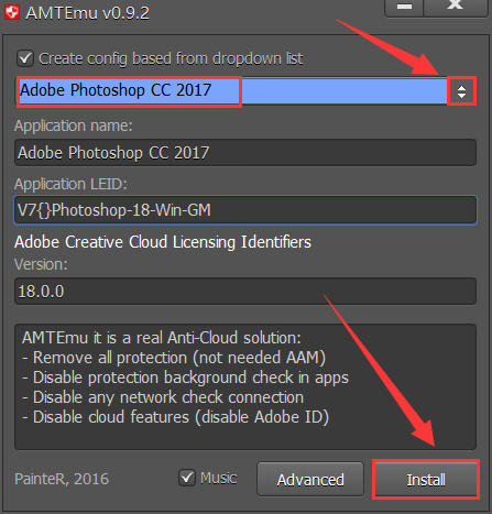 13.点击下拉菜单选择【Adobe Photoshop CC 2017】,然后点击【Install】。