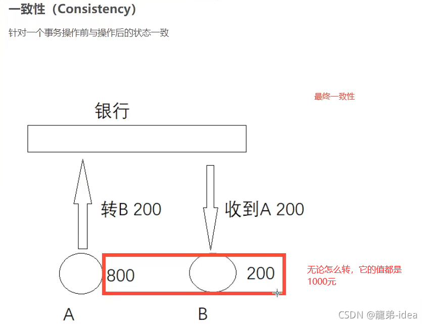 2.一致性(Conslstency):执行事务前后,数据保持一致,多个事务对同一个数据读取的结果是相同的;
