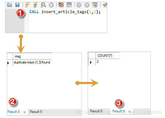 执行后会收到一条错误消息。 但是,由于我们将处理程序声明为CONTINUE处理程序,所以存储过程继续执行。因此,最后获得了文章的标签计数值为:3。来看个图: