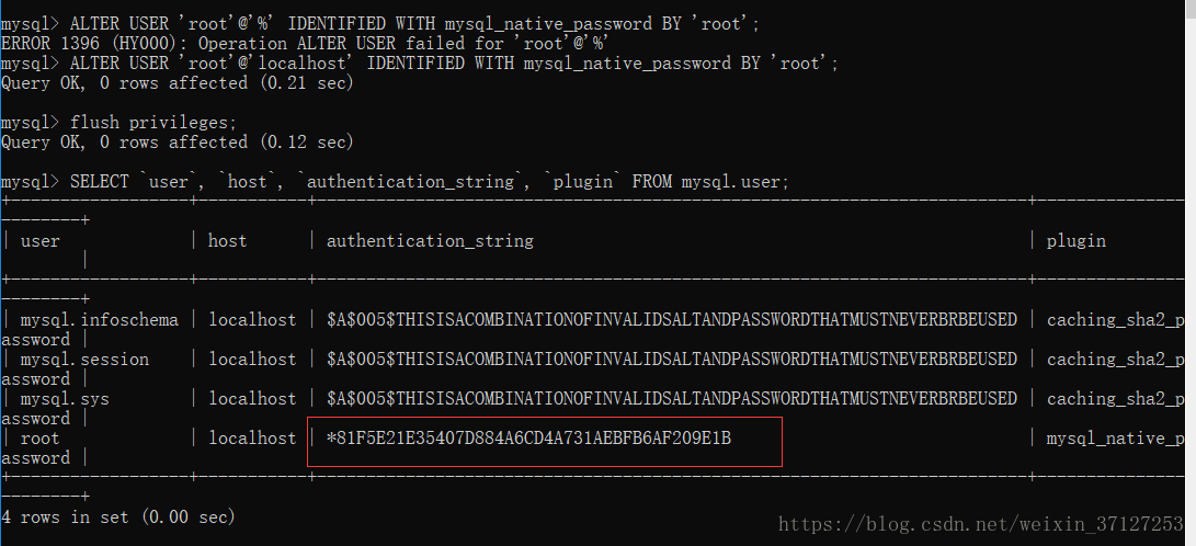 ALTER USER 'root'@'localhost' IDENTIFIED BY 'password' PASSWORD EXPIRE NEVER; #修改加密规则password是自己的密码,root也是登陆账户,下同。 ALTER USER 'root'@'localhost' IDENTIFIED WITH mysql_native_password BY 'password'; #更新一下用户的密码 FLUSH PRIVILEGES; #刷新权限