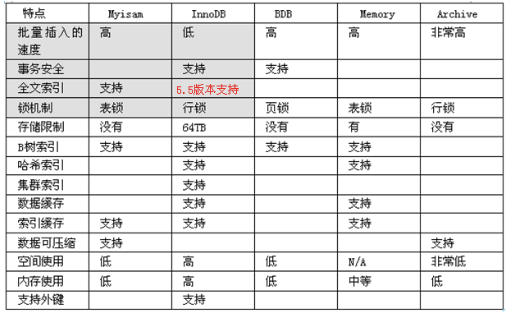 存储引擎可以理解为表的存储结构,每种存储引擎都支持不同的特性。MySQL支持插件式的存储引擎,可以为每张数据表指定不同的存储引擎。常用的存储引擎的特点整体如下:
