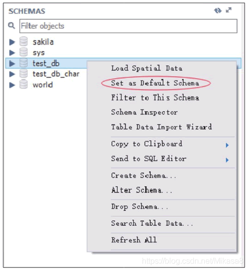 在 SCHEMAS 列表中可以选择默认的数据库,在需要指定默认的数据库上右击,选择 Set As Default Schema,如下图所示。该操作相当于命令行工具中的 USE<database_name> 命令。