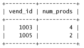 SELECT vend_id, COUNT(*) AS num_prods FROM products GROUP BY vend_id HAVING COUNT(*) >= 2;