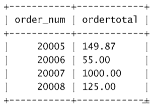 SELECT order_num, SUM(quantity*item) AS ordertotal FROM orderitems GROUP BY order_num HAVING SUM(quantity*item_price) >= 50;