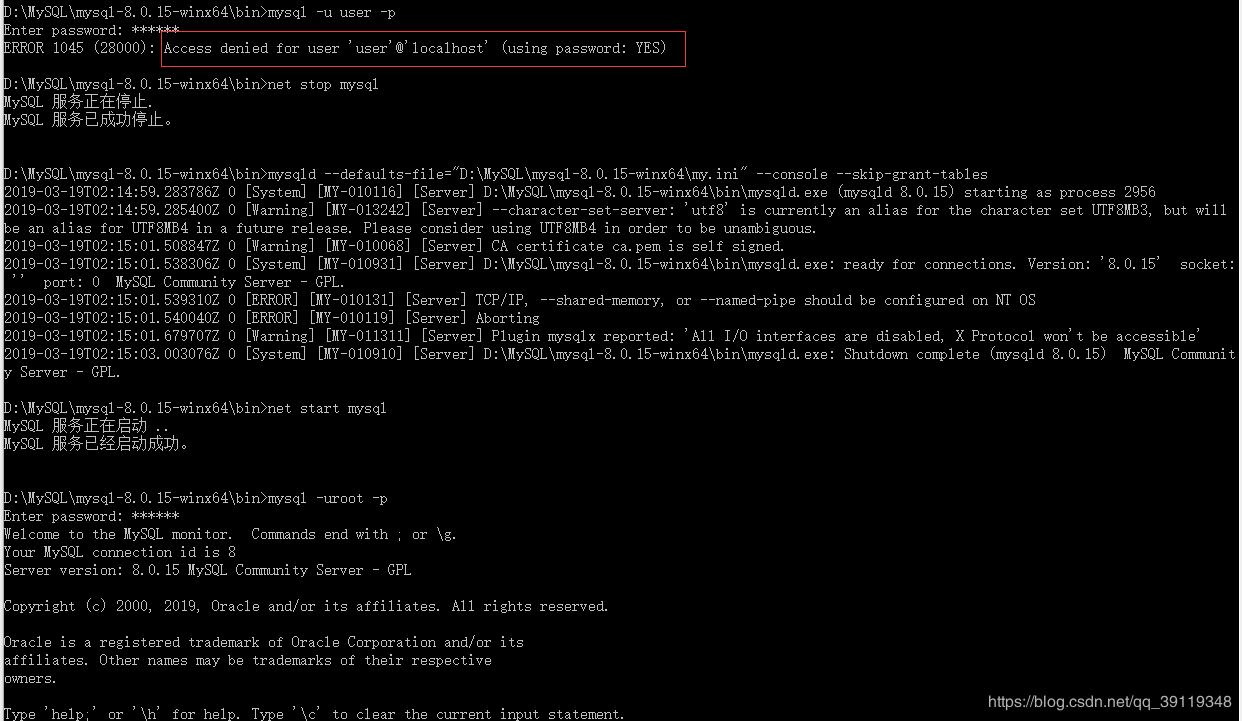 参考解决的博文在此处:解决win10下MySQL 8.0登录Access denied for user ‘root’@’localhost’ (using password: YES)的问题