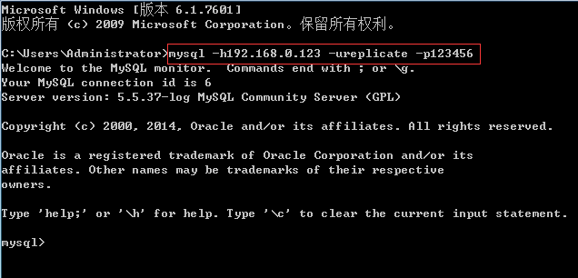 在从服务器(slave)上用replicat帐户对主服务器(master)数据库进行访问,看是否可以连接成功。