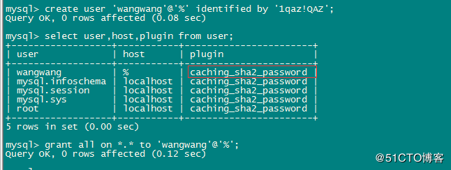 mysql> create user 'wangwang'@'%' identified by '1qaz!QAZ'; Query OK, 0 rows affected (0.08 sec) mysql> grant all on *.* to 'wangwang'@'%'; Query OK, 0 rows affected (0.12 sec) mysql> select user,host,plugin from user;