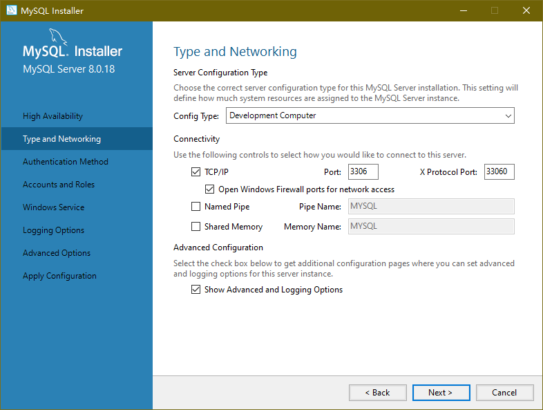 注:Open Windows Firewall ports for network access必须勾选,否则将不能远程访问。Show Advanced and Logging Options必选勾选,否则默认大小写不敏感。