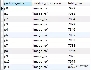 说明:奇数编号分区的ibd文件大小都是112k,这是创建分区表时初始化大小,实际并没有任何数据。我们可以通过SQL: select partition_name, partition_expression, table_rows from information_schema.partitions where table_schema = schema() and table_name=’image_subpart’ ;验证,其部分结果如下图所示: