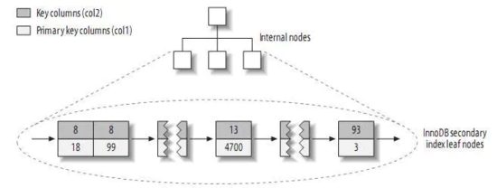 可以看到,和InnoDB中的主键索引不同,二级索引并没有在叶子结点存储所有的行数据信息,而是除了索引列的值外,只存储了这个数据行所对应的主键的信息。我们知道在MyISAM中,二级索引和主键索引一样,除了索引列的值外,只存储了一个指针(行号)的信息。