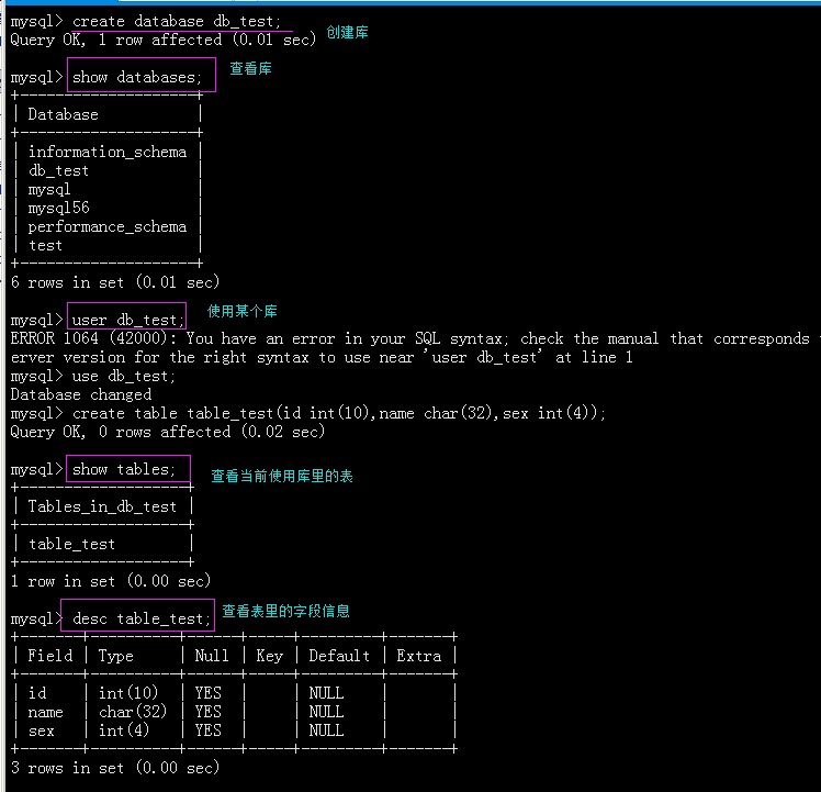 创建一张表:create table table_test(id int(10),name char(32),sex int(4));