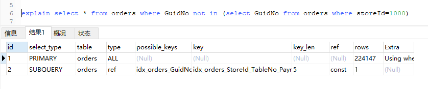 - unique_subquery:子查询中的返回结果字段组合是主键或者唯一约束。