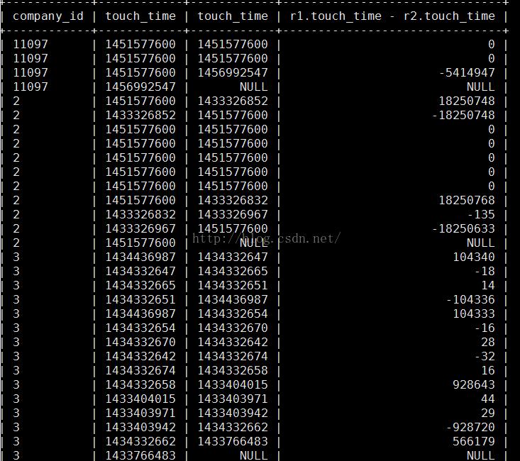 按照company_id不同分组,然后分别求出相同company_id相邻记录touch_time的差值