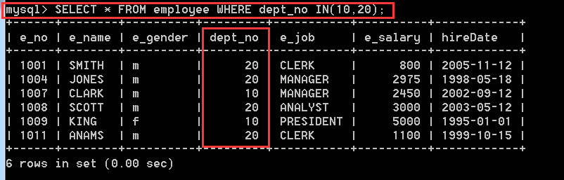 方式二:SELECT * FROM employee WHERE dept_no = 10 OR dept_no = 20;
