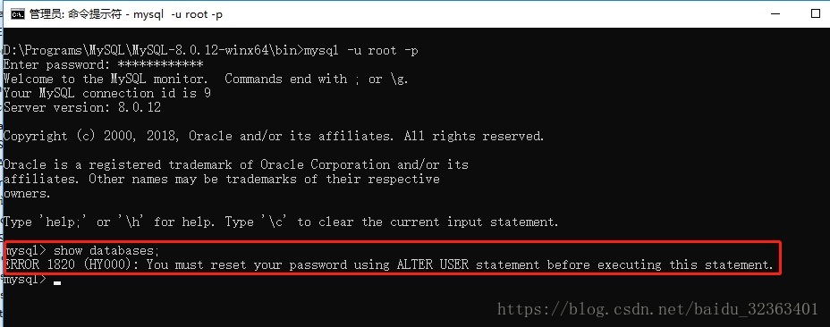 当然,还有一种初始化方式是不会产生随机密码的,但是也需要在正式使用数据库前设置密码,这个初始化指令为“mysqld –initialize-insecure –console”。当使用无随机密码初始化数据库时,首次登陆数据时需要使用“mysql -u root –skip-password”,即跳过密码验证方式登陆。