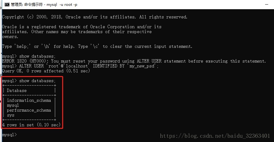 使用指令“ALTER USER ‘root’@’localhost’ IDENTIFIED BY ‘my_new_psd’;”,按回车键即可: