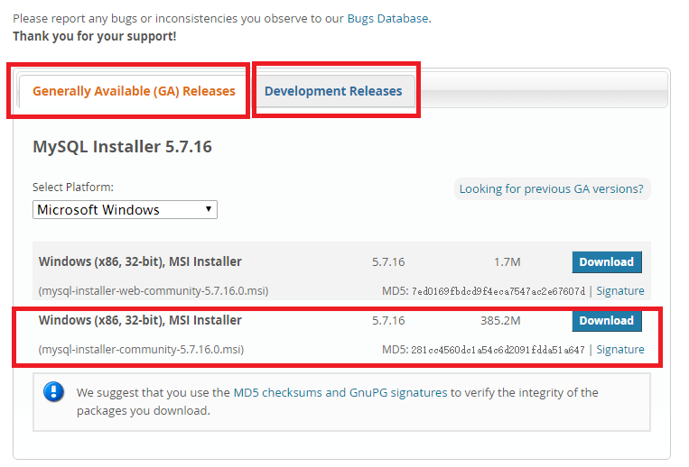 进入到MySql官方网站,进入到下载界面。看到这个,选择“MySQL Installer 5.7.16”,而不是“MySQL Installer 8.0.0 dmr”,选择“Windows (x86, 32-bit), MSI Installer” 385.2M的那个版本。