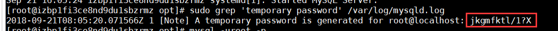 我们输入sudo grep ‘temporary password’ /var/log/mysqld.log就可以查看默认密码勒