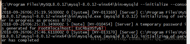 然后输入mysqld –initialize –console,会出现以下画面,其中红框内为数据库root用户的初始密码(一定要记住或保存!),后面登录需要用到。如果不小心关掉了或者没记住,删掉初始化生成的 data目录,再执行一遍初始化命令又会重新生成。